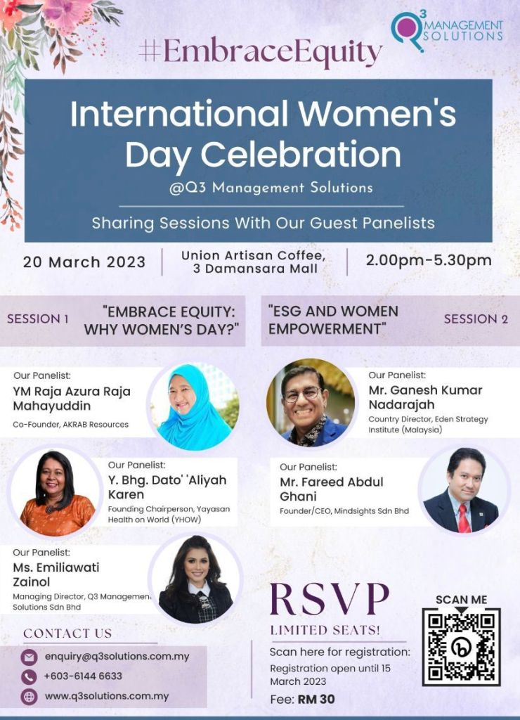 In celebration of International Women’s Day on March 2023, Q3 Management Solutions Sdn Bhd is hosting an exclusive event to embrace and celebrate gender equity for women. Led by influential panelists, including Mindsights very own Fareed Abdul Ghani, the event will delve into pertinent topics such as ESG (Environmental, Social and Governance) and Women Empowerment.